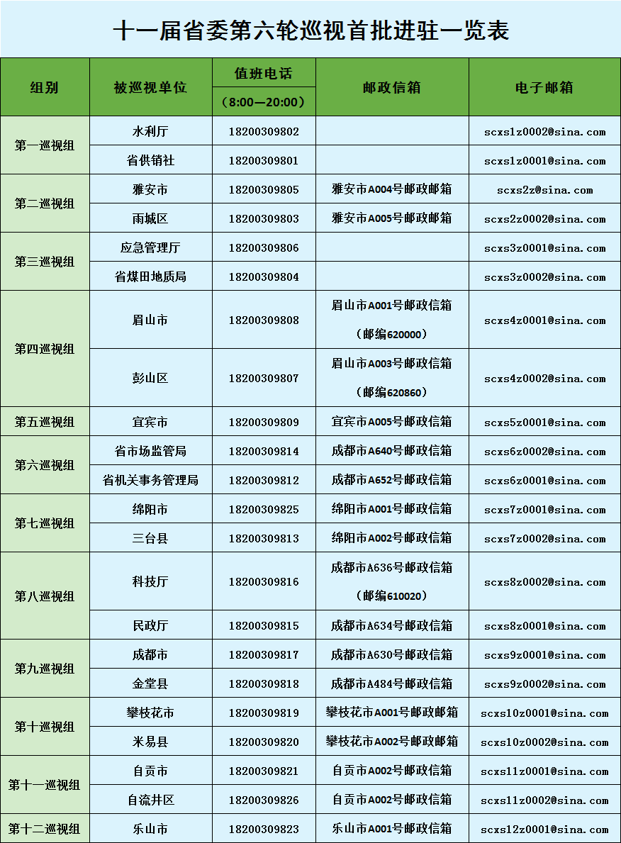 经省委批准,本轮巡视集中对73个地区和单位开展常规巡视。首批进驻的22个地区和单位分别为成都市、自贡市、攀枝花市、绵阳市、乐山市、雅安市、宜宾市、眉山市,金堂县、自贡市自流井区、米易县、三台县、雅安市雨城区、眉山市彭山区,以及科技厅、民政厅、水利厅、省市场监管局、应急管理厅、省机关事务管理局、省煤田地质局、省供销社。