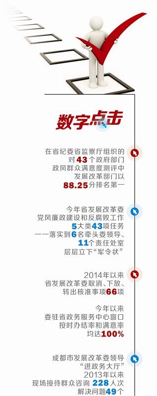 省发展改革委相关负责人介绍,党组书记逢会必讲党风廉政建设,要求班子成员带头改进作风,做联系群众的表率。委党组不仅在每年的党风廉政建设工作部署中,把政风建设作为必须抓好的重点,还就“改进作风怎么办”等专题展开思想碰撞。“下大力根治不作为、慢作为、乱作为、庸懒散浮拖等顽症”“建立行政权力依法规范公开运行三重监督体系”……这是今年省发展改革委党风廉政建设和反腐败工作任务中的内容。5大类43项任务,一一落实到6名牵头委领导、11个责任处室,层层立下“军令状”。