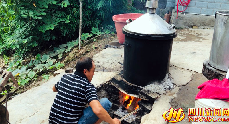 “一般来说,100斤粮食能烤出30来斤酒。”吴洪早告诉记者,玉米酒12元一斤,纯高粱酒20元一斤,一年纯收入能有1万余元。“烤酒时,火势越大越好”,他一边观察火势,一边察看出酒情况。记者看到,一个蒸锅与出酒铝桶并排齐放,两者之间用一根蒸馏排气管连接,不一会儿,酒就顺着管子过滤出来。