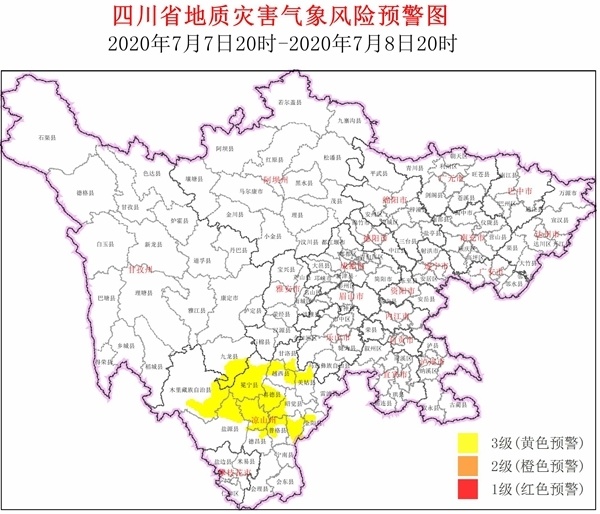 7月7日,四川省地质灾害指挥部办公室发布全省地质灾害气象风险预警,结合四川省气象台天气预报情况,7月7日20时~7月8日20时,甘孜、凉山部分地区为地质灾害气象风险等级为3级(黄色预警)。
