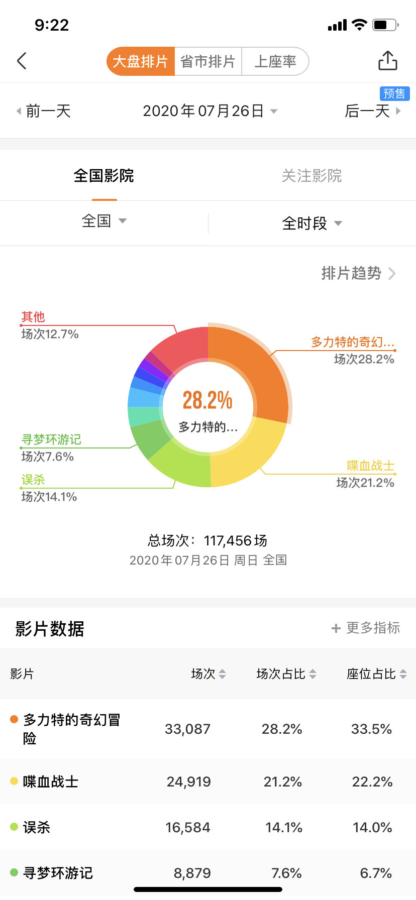 根据统计,周末两天票房最高的影片是7月24日新上映的《多力特的奇幻冒险》,排片基本占到20%以上,票房占比基本达到40%以上。《多力特的奇幻冒险》由斯蒂芬·加汉执导并编剧,小罗伯特·唐尼、安东尼奥·班德拉斯、迈克尔·辛、吉姆·布劳德本特、哈里·科莱特等主演的奇幻电影。该片根据英国作家休·洛夫廷所著同名儿童文学作品改编,讲述杜立德医生以救助动物为第一要任,每天和动物们生活在一起,还会说各种动物的语言。童真的风格,充满想象力的奇妙故事,让影片吸引不少家长带着孩子一同观影。