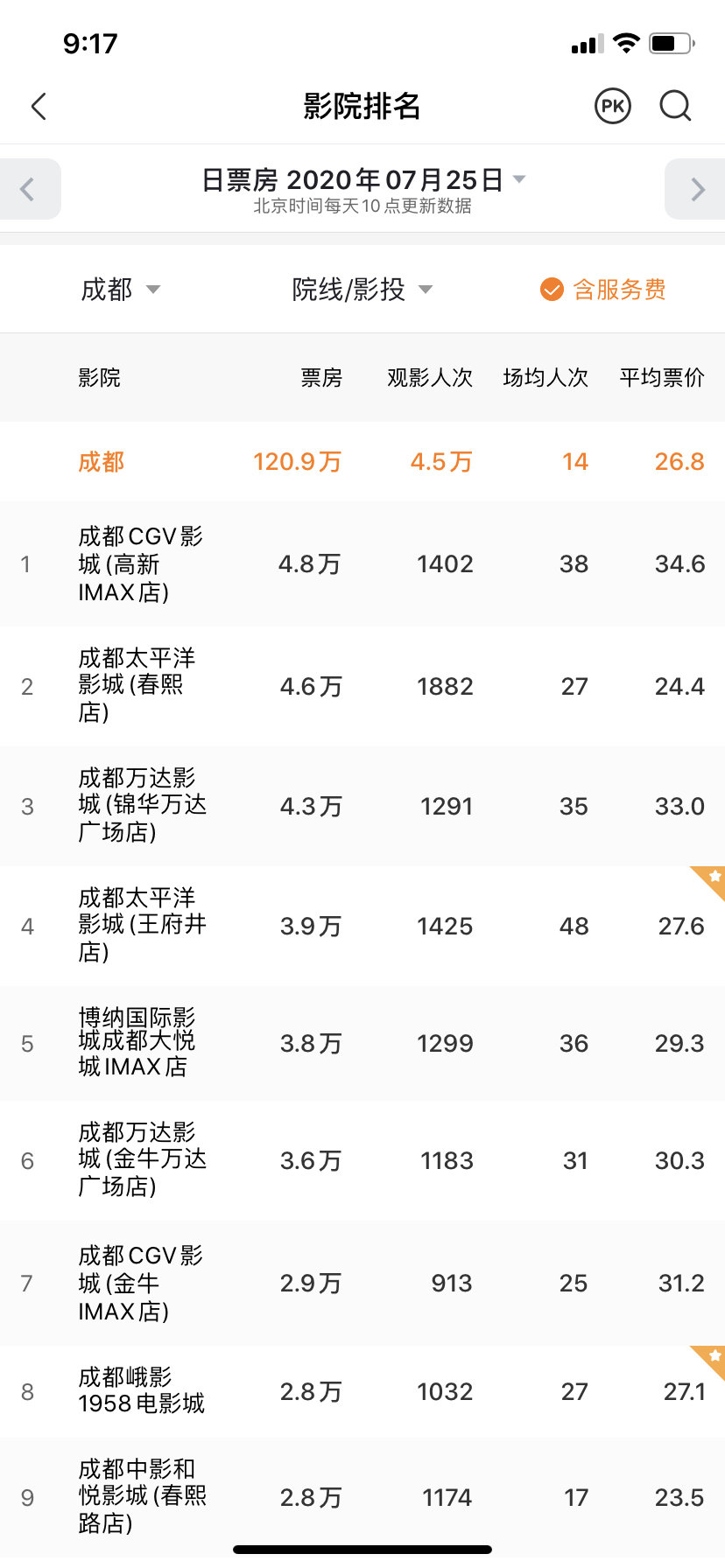 从影院来看,7月25日,成都影院票房120.9万元,观影人次4.5万人次,其中票房最高影院为CGV影城(高新IMAX)店,单日票房达到4.8万元;7月26日,截至21:00,成都影院票房为105万元,观影人次4.1万人次,CGV影城(高新IMAX)店也是票房最高影院,为4万元。