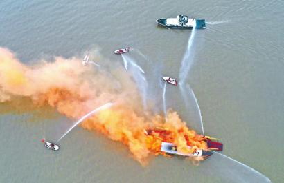消防指战员进行船舶火灾事故救援演练。