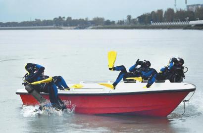 消防潜水员潜入江中进行水下救援演练。
