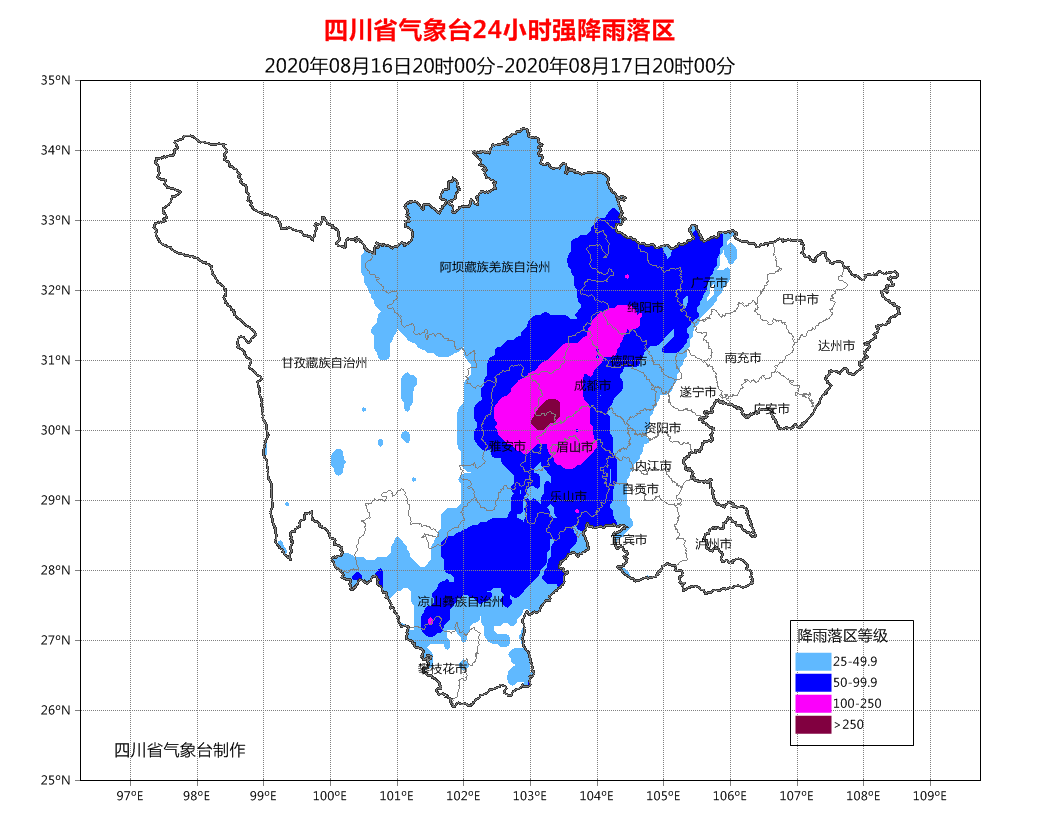 8月16日16时00分,四川省气象台将暴雨黄色预警升级为暴雨橙色预警:16日20时到17日20时,广元、绵阳、德阳、宜宾4市西部和成都、眉山、乐山、雅安4市有暴雨(雨量60~90毫米),其中,绵阳、德阳、成都、眉山4市西部和雅安北部的局部地方有大暴雨(雨量120~200毫米),个别地方雨量可达250毫米以上。阿坝州和甘孜州东部以及凉山州有大雨到暴雨(20~50毫米),其中,阿坝州东部、甘孜州东部和凉山州北部的局部地方有大暴雨(50~120毫米)。