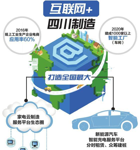 2016年,四川将全面开展中国制造2025公共服务平台、工业云等“互联网+四川制造”区域试点;重点培育10家“互联网+”省级中小企业公共服务示范平台;在20家企业开展运用电子商务强化供应链管理示范,规模以上工业生产企业电子商务应用率达到60%。