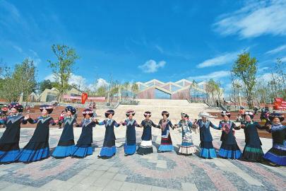 八月二十九日,在凉山州昭觉县沐恩邸社区火把广场上,易地扶贫搬迁的群众身着艳丽的民族服装,手牵手跳起了欢快的达体舞。本报记者华小峰摄