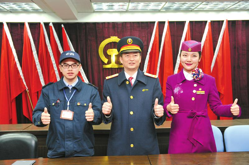 12月22日,成都市火车北站,成渝高铁首发车车组亮相(从左到右:地勤机械师昝沛希、首发司机杜辉、首发列车长吕璐)。