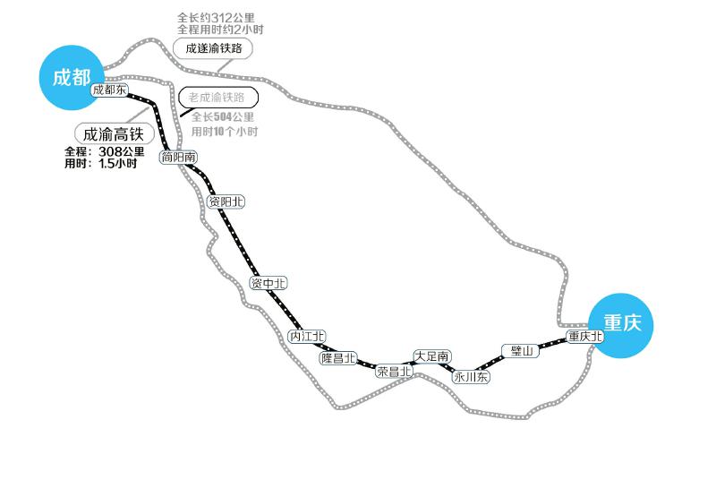 预计开通后会开行成都重庆两地的直达列车,也会开行经停沿线部分站点的列车,直达列车预计耗时为1.5小时,较目前的成遂渝线缩短约半小时。