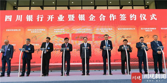 开业暨签约仪式上,中国人民银行成都分行向四川银行颁发《同意四川银行加入人民银行金融管理与服务体系通知书》,四川银保监局向四川银行颁发《金融许可证》;四川银行与18家实体经济企业签署银企合作协议,授信额度600亿元,涵盖“5+1”现代工业、“10+3”现代农业和“4+6”现代服务业。