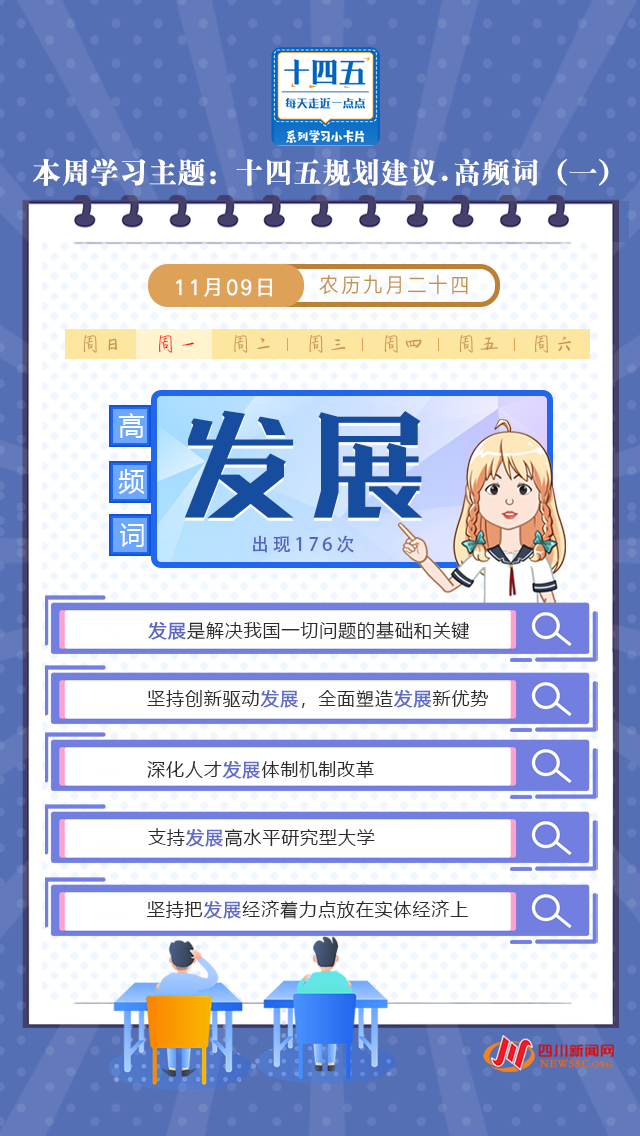 11月9日起,四川新闻网推出知识解答类策划《十四五,每天走近一点点》,聚焦“十四五”规划,每周一个学习主题,每天一张学习卡,带你换个方式学习五中全会精神。
