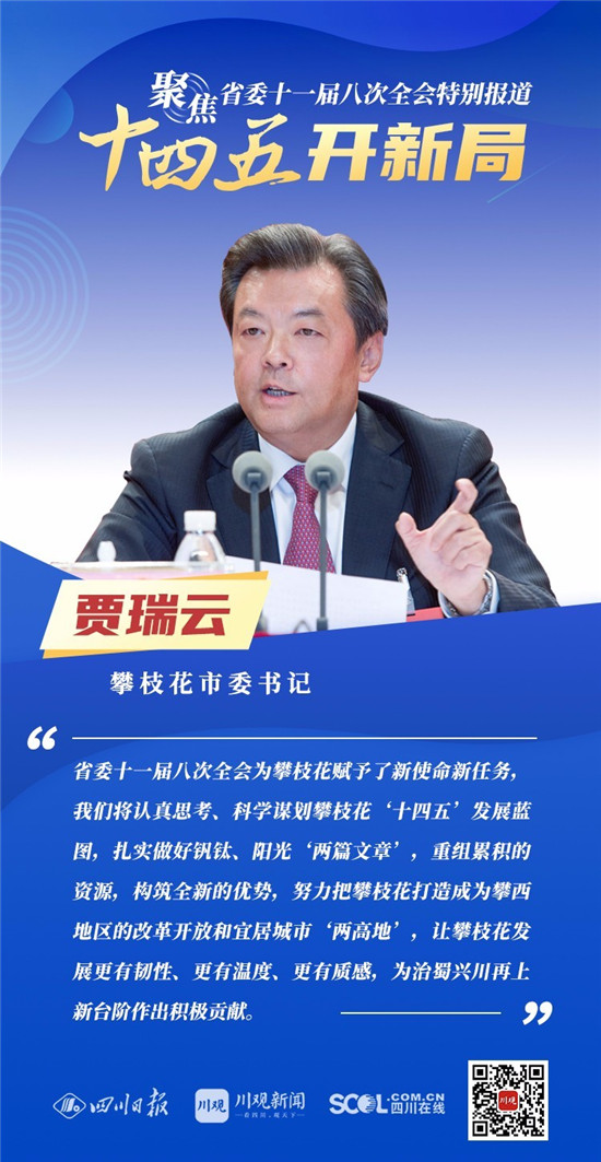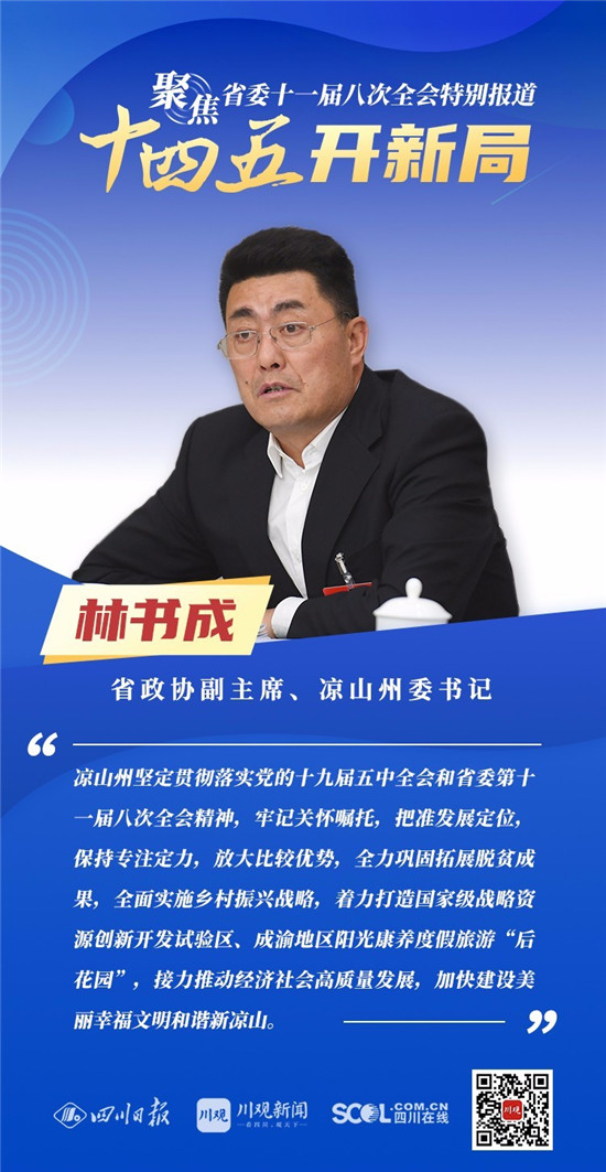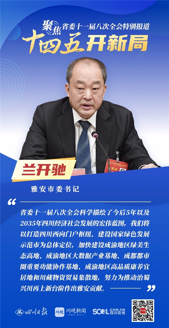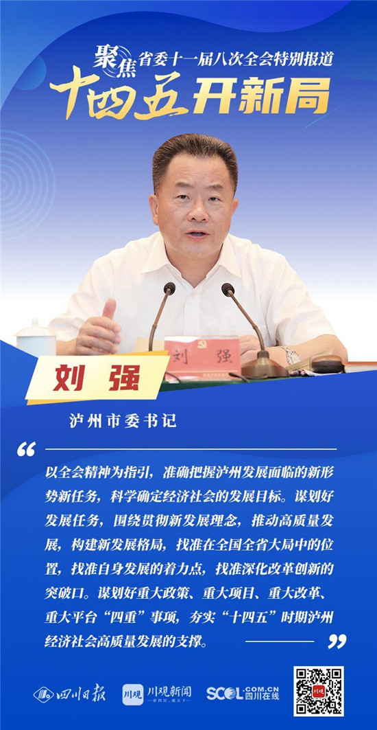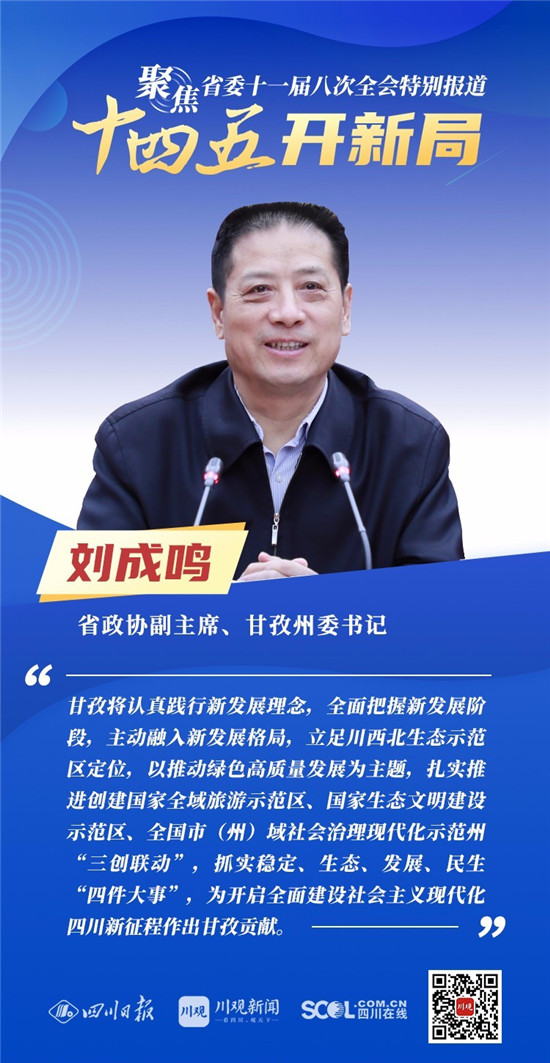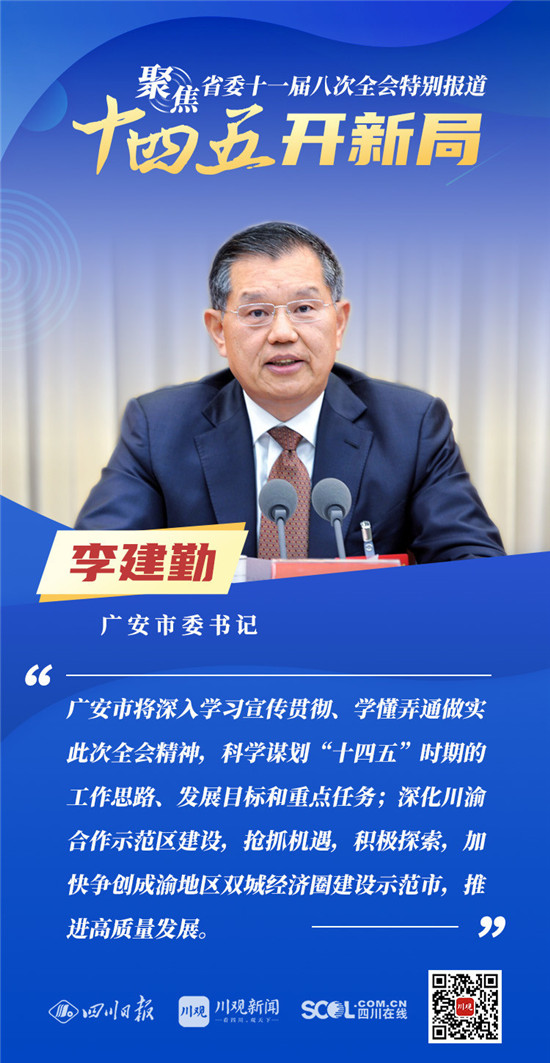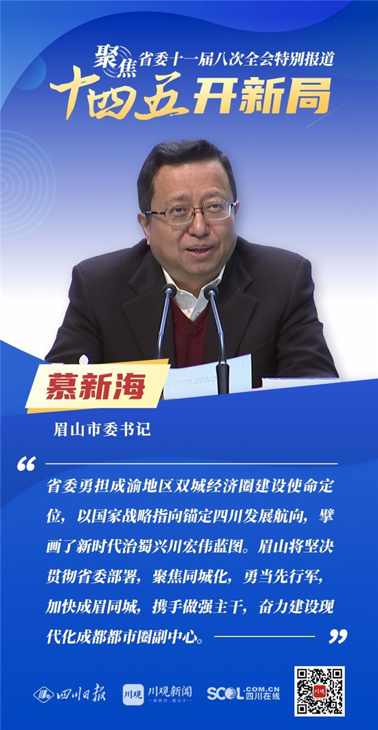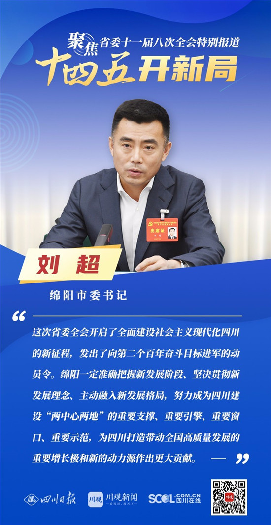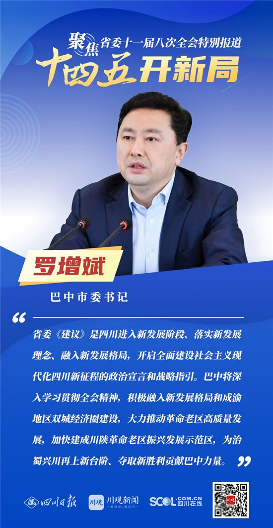 12月3日,中共四川省委十一届八次全会在成都开幕,全会将深入学习贯彻党的十九届五中全会精神,审议《中共四川省委关于制定四川省国民经济和社会发展第十四个五年规划和二〇三五年远景目标的建议(讨论稿)》,为未来5年乃至更长时期四川发展谋划新蓝图 。
