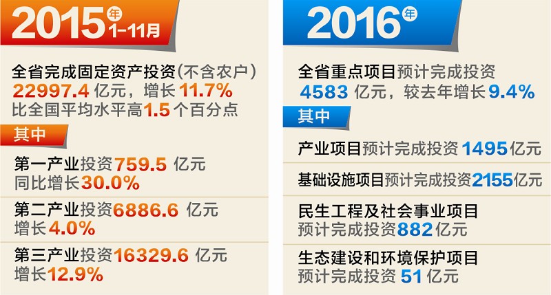 以2014年为例,在全国经济压力持续加大的背景下,我省经济增速依然保持在8.5%。达到这样的目标,投资发挥了主力军作用,全年完成全社会固定资产投资2.36万亿元,比上年增长12%,投资率超过80%。2015年前三季度,全省全社会固定资产投资同比增长10.8%,对于全省经济的平稳运行奠定了坚实基础。“2016年我省初步安排投资增速不低于两位数。”唐利民说。“稳投资就是聚精神。”在南充市委书记李仲彬看来,当前,内外部形势复杂严峻,抓项目就是把各级党员干部的精气神集中到经济建设上来,聚精会神搞建设,一心一意谋发展。