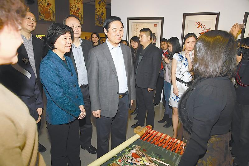一月六日下午,中共中央政治局委员、中央书记处书记、中宣部部长刘奇葆,全国人大常委会副委员长、全国妇联主席沈跃跃,在京参观“川针引线·巧手致富———四川妇女居家灵活就业成就暨传统手工艺术展”。陈鹏摄