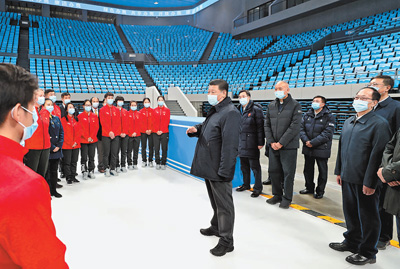 1月18日至20日,中共中央总书记、国家主席、中央军委主席习近平在北京、河北考察,并主持召开北京2022年冬奥会和冬残奥会筹办工作汇报会。这是18日上午,习近平在位于北京市海淀区的首都体育馆,同国家花样滑冰队和短道速滑队运动员、教练员等亲切交流。新华社记者 王 晔摄