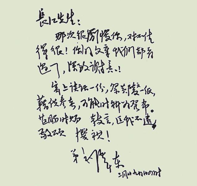 “长江先生:那次很简慢你,对不住得很!你的文章我们都看过了,深致谢意!寄上谈话一份,祭黄陵文一纸,藉供参考,可能时祈为发布。甚盼时赐教言,匡我不逮。敬颂撰祺!弟 毛泽东”。