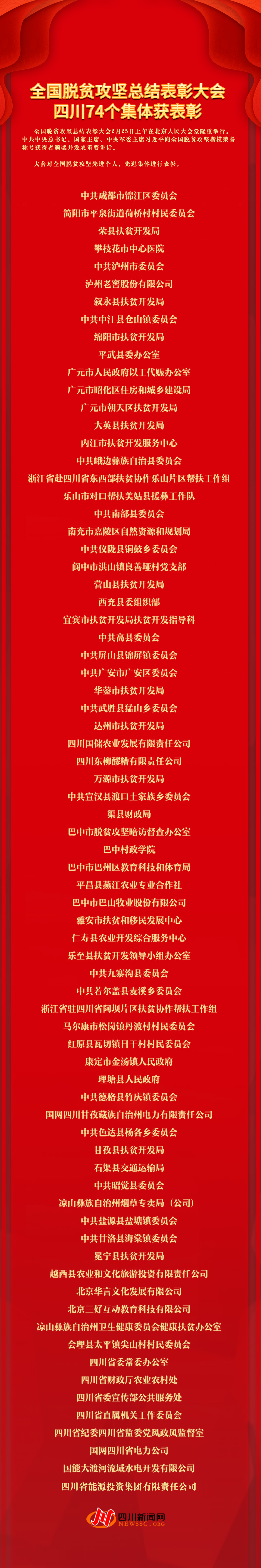 大会表彰1981名全国脱贫攻坚先进个人,以及1501个全国脱贫攻坚先进集体。四川共有98名个人、74个集体上榜。