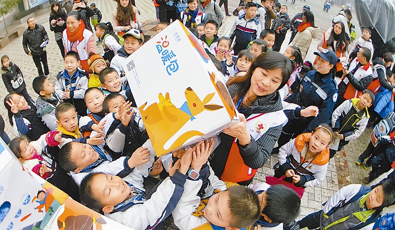 2015年12月31日,南充市红十字会志愿者协会、南充爱跑团等组织了20多辆爱心车、40多位志愿者,把141个温暖包送往营山县金华希望学校和丰产乡、东升乡、通天乡、星火乡、清水乡等农村学校。温暖包内有羽绒服、围巾手套等生活用品,书包、画笔等学习用具,还有毛绒玩具。张力 摄