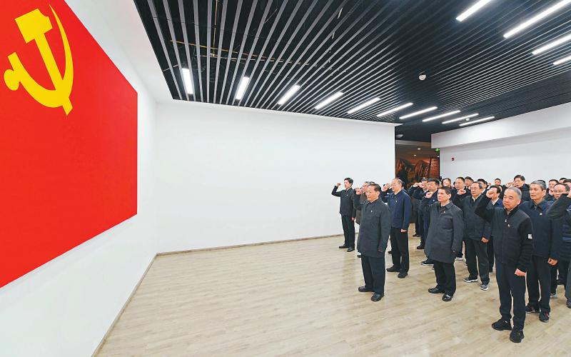 4月7日,在长征干部学院雅安夹金山分院参加党史学习教育省级领导班子中心组学习暨省级领导干部专题读书班的全体学员,在省委书记、省人大常委会主任彭清华带领下集体重温入党誓词。 四川日报全媒体记者 欧阳杰 摄