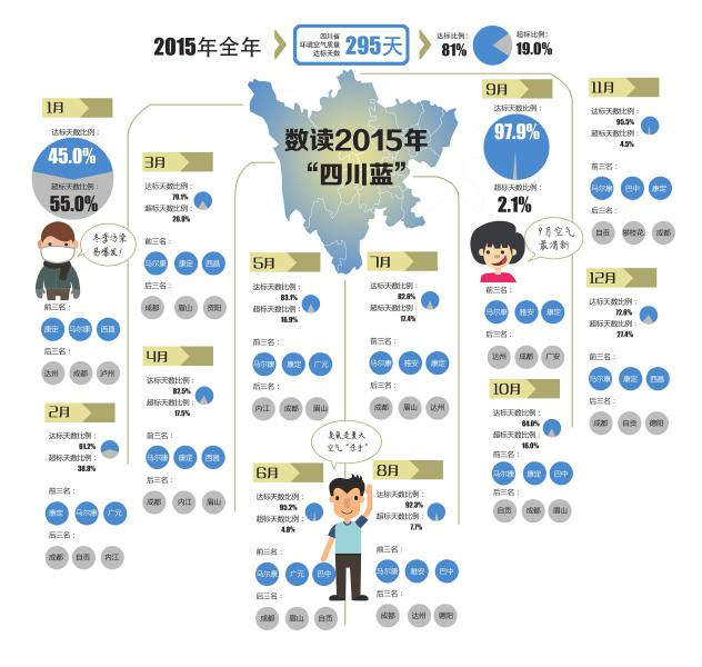 哪座城,空气最清新?哪座城,常被拖后腿?哪个月,重霾天最多?2015年已落下帷幕。四川21个市(州)的年度空气“大考”,交出了怎样一份“蓝天”答卷?