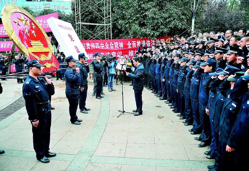 泸州市江阳区新提拔的科级干部、新入职的公务人员、拟提拔到领导岗位的后备干部等,面向宪法和国徽庄严宣誓。 本报记者 肖雨杨 摄(资料图片)