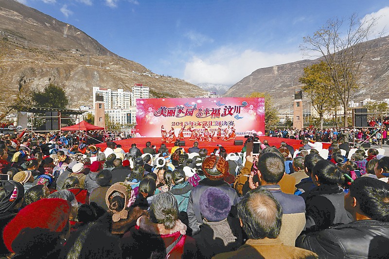 2015年12月16日,汶川县锅庄广场举行了2015年文艺汇演决赛。当地群众通过民族舞蹈、声乐、小品、快板等节目,展现出汶川浓郁的羌民族地域文化特征。张莞 摄(视觉四川)