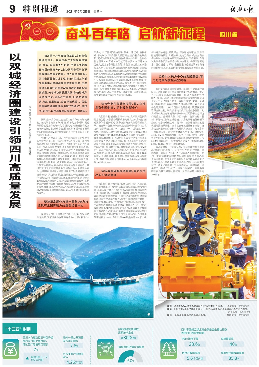 四川是一片孕育红色基因、富有革命传统的热土。在中国共产党领导我国革命、建设、改革的各个时期,巴蜀儿女朝着党指引的正确方向,推动四川各项事业不断取得新的重大成就。进入新发展阶段,四川全面贯彻习近平总书记对四川工作系列重要指示精神和党中央决策部署,把成渝地区双城经济圈建设作为战略引领和宝贵机遇,矢志推动高质量发展,加快形成产业结构优化、创新活力旺盛、区域布局协调、城乡发展融合、生态环境优美、人民生活幸福的发展新格局,唱好“双城记”、建好“经济圈”,以优异成绩庆祝建党100周年。