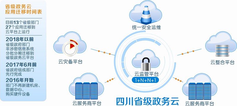 至此,四川省政务云领导小组提出的“1+N+N+1”模式已初具雏形,即一个云监管平台、多个云服务商平台、多个部门整合平台、一个云灾备平台,从体系构架上化解监管难题,从制度建设上保障服务质量。