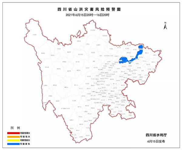 同时,6月15日17时30分,四川省水利厅发布山洪灾害蓝色预警显示,6月15日20时至16日20时,南部、阆中、恩阳、南江、梓潼、剑阁等县(市、区)可能发生山洪灾害。