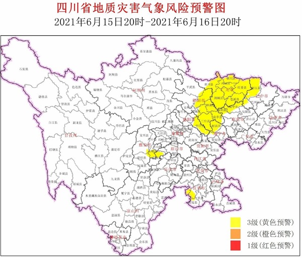 不仅如此,四川省地质灾害指挥部办公室也发布6月15日20时至6月16日20时全省地质灾害气象风险黄色预警,涉及我省30个县市区。