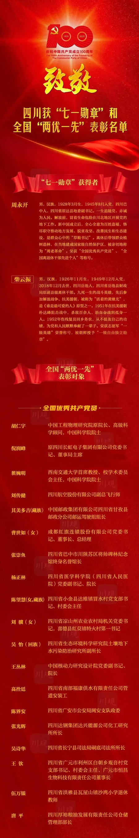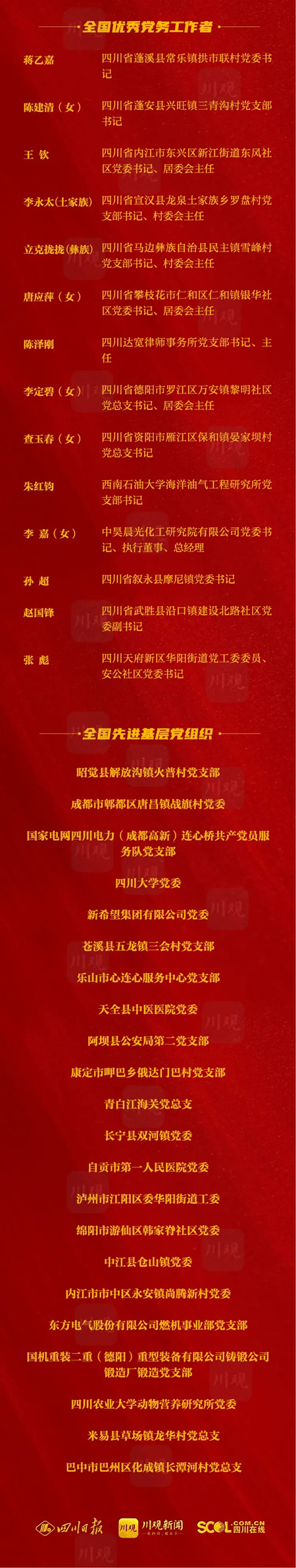 此次受表彰的“两优一先”名单中,四川有胡仁宇等19人获得“全国优秀共产党员”;蒋乙嘉等14人获得“全国优秀党务工作者”;昭觉县解放沟镇火普村党支部等22个党组织获得“全国先进基层党组织”。