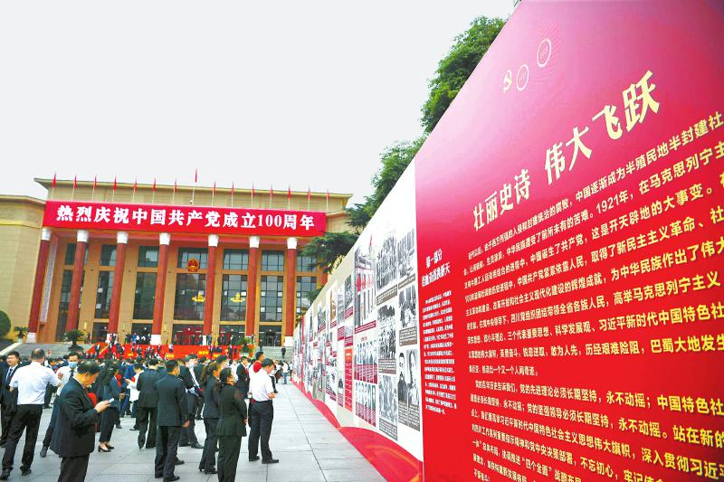 6月30日,四川省“两优一先”表彰大会在成都举行。图为参会代表观看会场外的展览。 四川日报全媒体记者田为摄