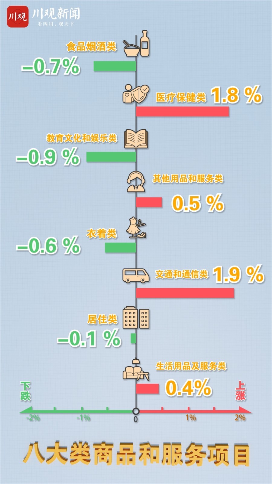 上半年,居民人均生活消费支出 9841 元,同比增长13.4%。四川居民消费价格(CPI)上涨0.1 %,CPI整体涨幅处于历史同期低位。列入统计的八大类商品和服务项目“四涨四跌”。其中,全省上半年生猪出栏2928.7万,同比增长31. 4%。猪肉价格明显回落,价格下降41.3%。