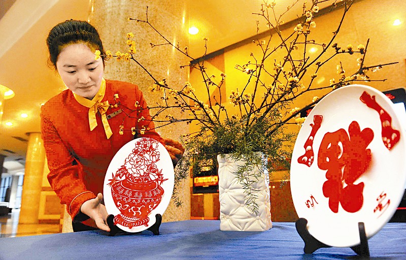 1月22日,大会工作人员用清香四溢的梅花和剪纸艺术布置省政协十一届四次会议接待大厅。 四川日报记者 吴传明 摄