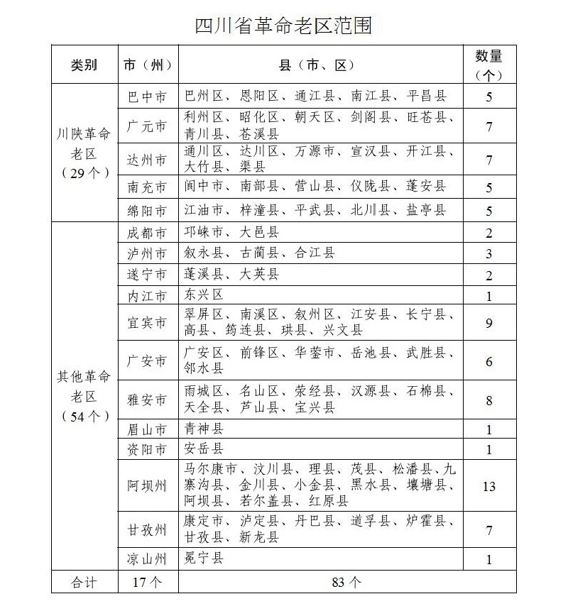 四川革命老区,是指17个市(州)所辖的83个县(市、区)。其中,川陕革命老区包括巴中、广元、达州、南充、绵阳等5个市所辖的29个县(市、区)。