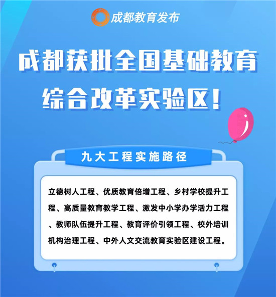 建设全国基础教育综合改革实验区,成都市将聚焦育人方式改革,实施“九大工程”,加强五项管理,推动“五育融合”,促进学生德智体美劳全面发展,培养德才兼备、全面发展、担当民族复兴大任的时代新人。(图片来自成都教育发布)