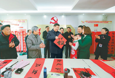 在东湖区彭家桥街道光明社区,习近平视察社区宣传栏和社区服务站办事大厅,了解社区党建工作、便民服务、创建和谐等情况。习近平听取社区通过开设道德讲堂开展社会主义核心价值观培育的情况介绍,指出培育社会主义核心价值观是一件大事,全社会都要努力抓,社区要利用自己的平台和优势做好。社区书画室里,一些书法爱好者正在写春联,习近平来到他们中间给他们拜年。一位小朋友写下一个“福”字送给习爷爷,习近平拿到手上展示,祝大家都幸福。习近平还观看了社区合唱团排练,称赞她们有激情、唱得好,祝她们歌声常伴美好生活。广场上,社区居民们正在观看舞狮灯彩队排练。看到总书记来了,大家纷纷围拢过来向总书记问好,向总书记拜年。习近平向大家致意,给大家拜年,同大家一起观看了排练,整个广场洋溢着热烈祥和的气氛。