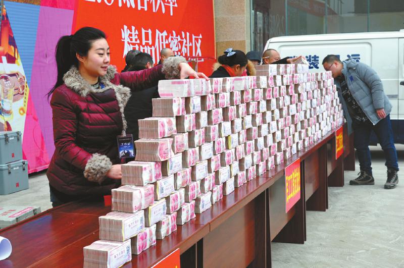 2月2日上午,四川乐山犍为县一楼盘工地,武装押运车运来近2300万元现金,每10万元一摞,砌成一座“钱山”。令大家高兴的是,亲手发工资的是他们的美女老板。