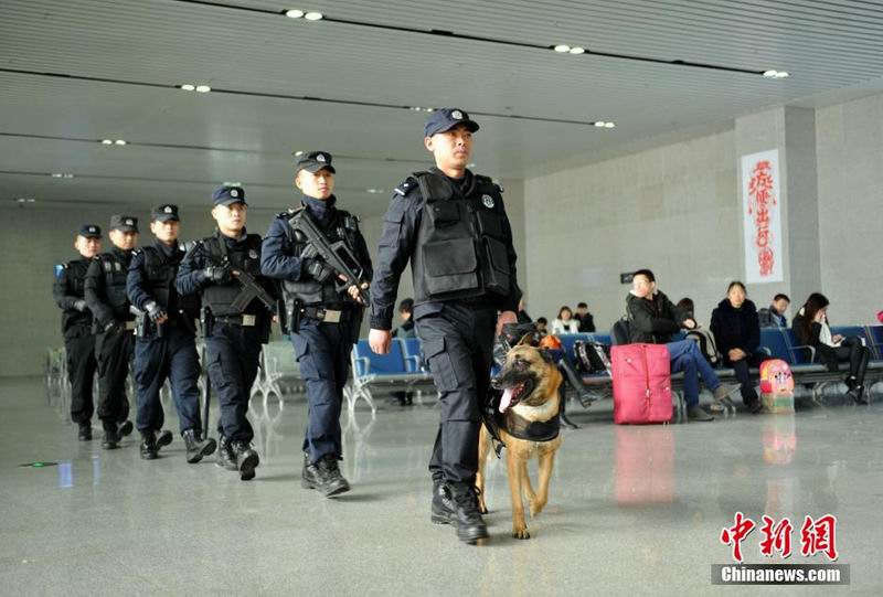2月4日,春运期间四川乐山警方除设立固定执勤岗位外,特警、武警还携带武器、警犬进行武装巡逻,加强车站、景区等区域的安全保障,让民众过一个欢乐祥和的春节。