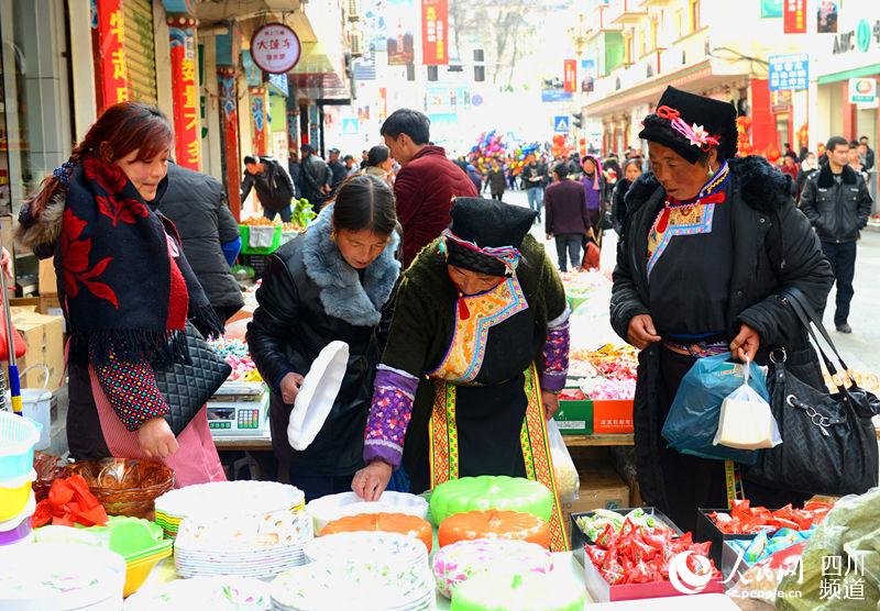 人民网成都2月5日电 (记者 陈曦)人民网记者新春走基层,2016年的新春佳节即将来临,记者来到阿坝州藏族羌族自治州小金县,县城内人潮涌动,超市里里外外也装扮一新,人们大包小箱的忙着置办着年货,中国结、春联、灯笼、对联等随处可见,让过往购物的群众满眼见到的都是一片吉祥如意,传统的烫金“福”字,透着祝福话语的春联,光彩夺目的灯笼,带着浓浓民族色彩的中国结和各种挂件饰品,琳琅满目,让人目不暇接。