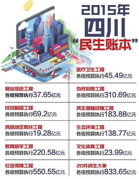 2月15日,省政府官方网站晒出了2015年咱们四川省的“民生账本”,对2015年全省十项民生工程及20件民生大事完成情况“报盘”。其中,花钱的地方涉及了就业促进、扶贫解困、民族地区帮扶、教育助学、社会保障、医疗卫生、百姓安居、民生基础设施、生态环境、文化体育等一百余项民生实事。