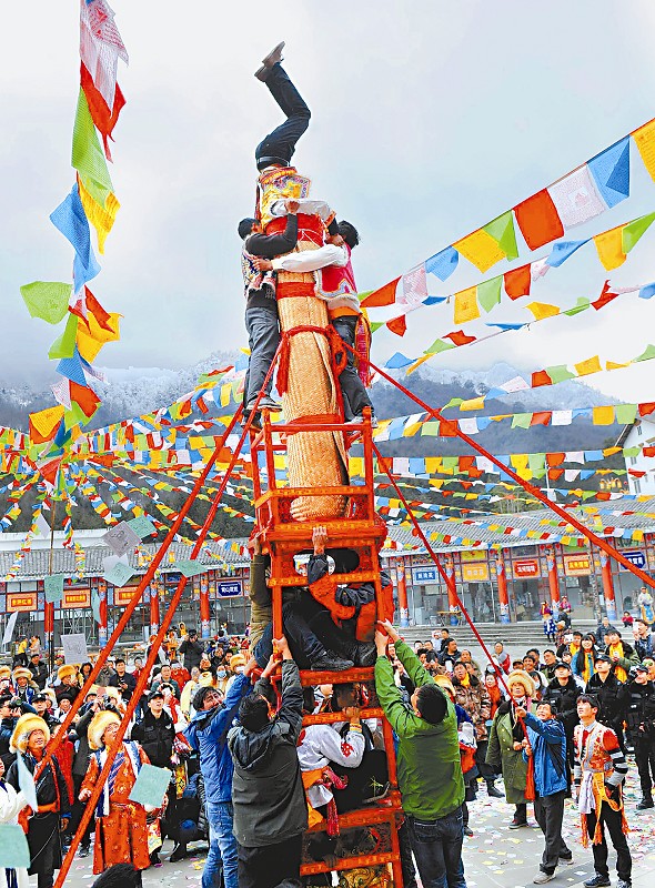 农历正月初九,位于夹金山下的宝兴县硗碛藏族乡锣鼓喧天,硗碛藏族风俗文化庆祝盛会——“上九节”拉开帷幕,当地群众和游客们一起载歌载舞喜庆节日。