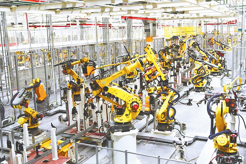 神龙成都工厂实现了100%焊接自动化。图为焊装车间的工业机器人。 (神龙成都工厂供图)