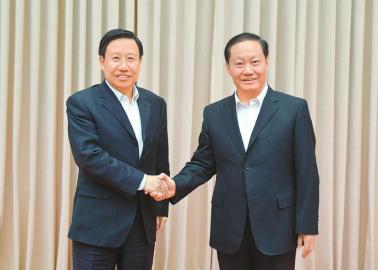 4月22日,彭清华同志与王晓晖同志在全省领导干部会议上亲切握手。