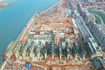 4月22日,岷江龙溪口航电枢纽11孔泄洪闸正抓紧建设。