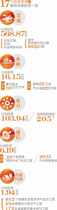 根据《计划》,基础设施建设扶贫被列为17个扶贫专项的首位,年内我省基础设施建设扶贫攻坚将投入697.09亿元,涉及交通、水利、电力、通信、农村能源基础设施5个方面。