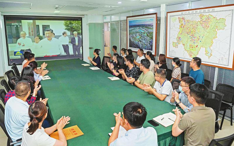 6月9日晚,四川天府新区公园城市建设局党员干部收看中央广播电视总台新闻联播播出的习近平总书记在川考察的新闻报道。 四川日报全媒体记者 何海洋 摄