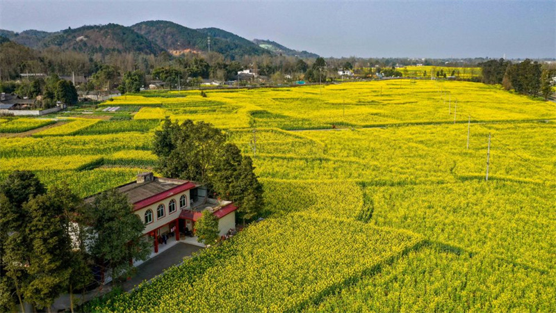 在四川成都崇州市拍摄的油菜花田(2020年2月25日摄,无人机照片)。新华社记者 王曦 摄