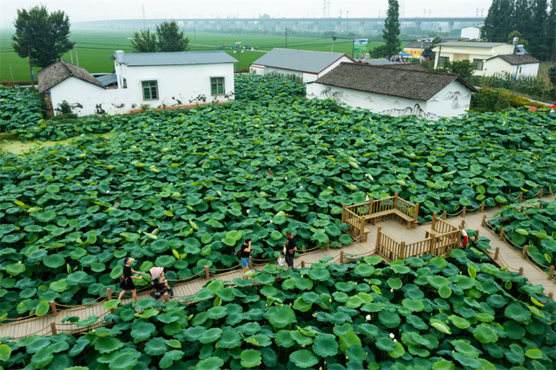 人们在四川省眉山市东坡区太和镇永丰村欣赏荷塘美景,荷塘旁边就是村里处理生活污水所用的埋于地下的污水收集池、沉渣池、四级厌氧池等(2022年6月22日摄)。新华社记者 沈伯韩 摄