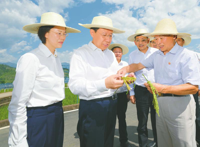 八月十一日,省委书记王晓晖到米易县稻菜现代农业园区调研,在园区内的袁隆平第三代杂交水稻超高产攻关示范片,仔细察看高标准农田建设和高产水稻长势,认真比对不同水稻品种结穗数量。四川日报全媒体记者欧阳杰摄